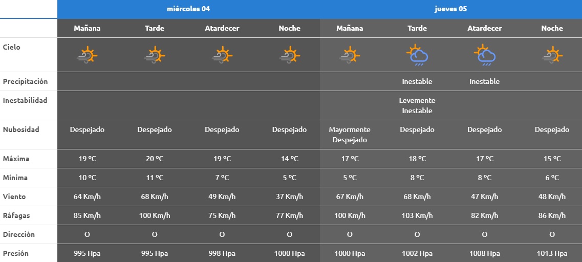 Hoy fue anunciado como el peor día, con vientos de 60 km/h que a lo largo de la jornada llegarían a desarrollar ráfagas de hasta 100 km/h, lo que ya generó la suspensión de todas las actividades educativas. Temen por daños materiales e incendios.