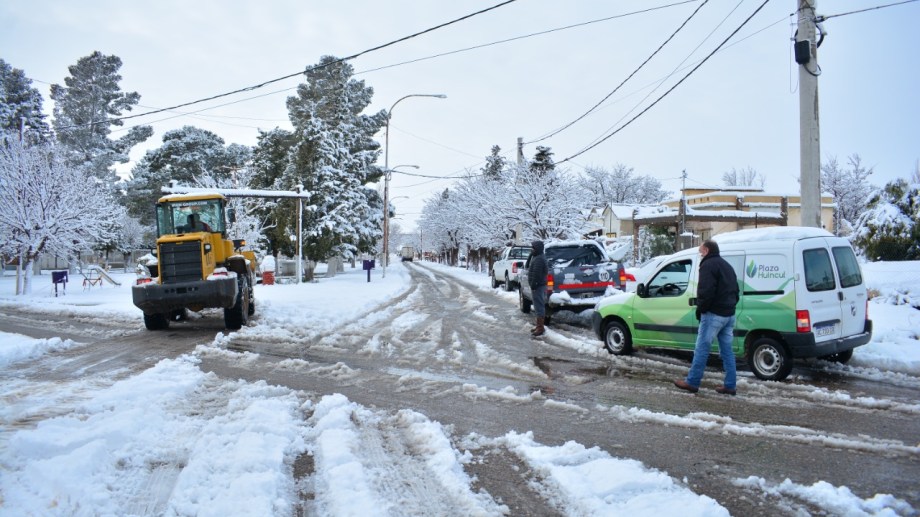 En Plaza Huincul, si bien la cantidad de nieve caída fue menor (alrededor de 30 a 40 centímetros) los inconvenientes se multiplicaron. Hubo que realizar limpieza con máquinas retroexcavadoras de los accesos rápidos y de las arterias más transitadas. La prioridad fueron aquellas que tienen mayor circulación de personas. Durante el jueves se dispuso asueto municipal.
