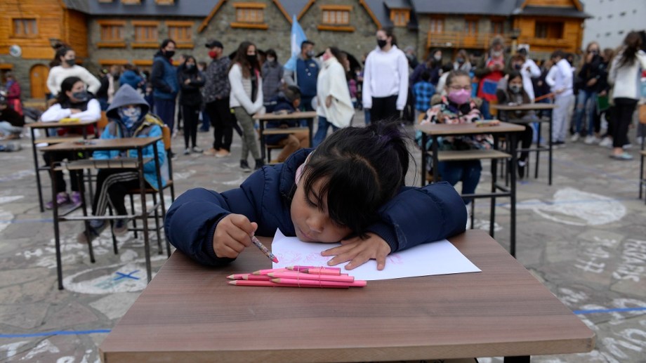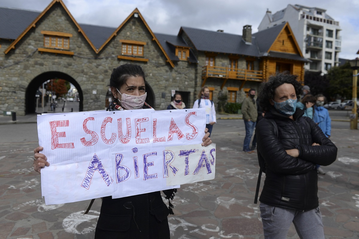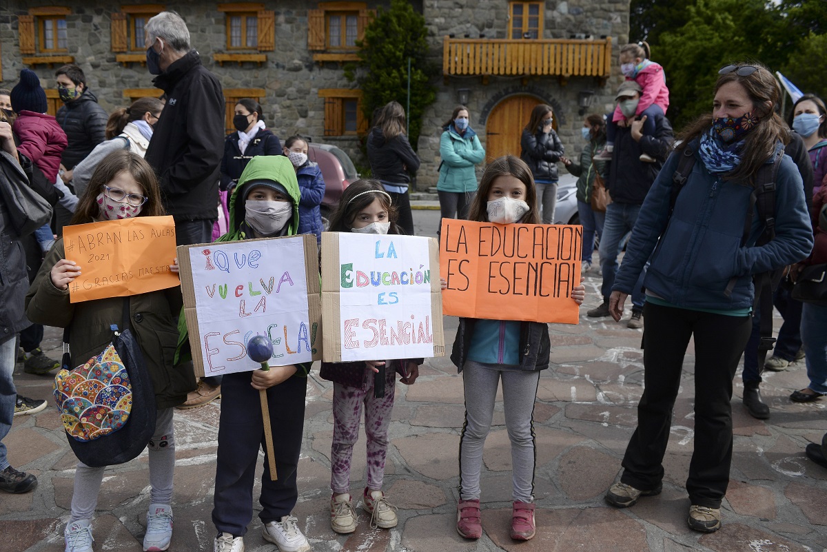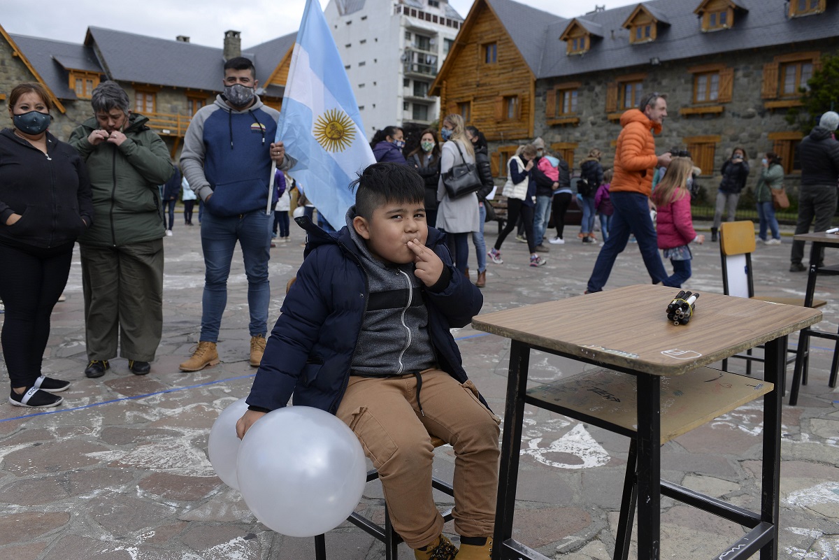 Con bancos y mesas escolares instaladas en el Centro Cívico y niños con cuadernos y lápices, un grupo de padres exigió ayer en Bariloche precisiones por el retorno a clases presenciales en el ciclo 2021 y por los actos en las escuelas públicas.