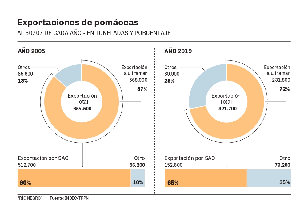 Los estudios de los últimas 15 temporadas dan cuenta de este nuevo contexto. Durante los primeros siete meses del 2005 las exportaciones de peras y manzanas argentinas totalizaban, hacia los distintos mercados del globo, unas 654.500 toneladas. Las estadísticas oficiales reflejan que, en ese entonces, el 78% (512.700 toneladas) de las ventas externas se orientaban por el puerto rionegrino de SAE hacia ultramar.