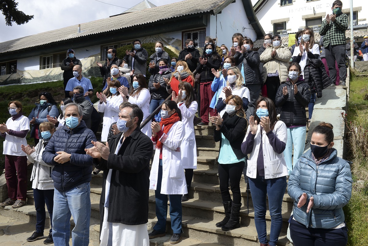 Los profesionales del hospital Ramón Carrillo optaron por una modalidad de manifestarse en silencio, de brazos cruzados y con aplausos, solo unos minutos en las escaleras del centro de salud, debido a que hacen una pausa en la tarea diaria que se incrementó con la pandemia del coronavirus.