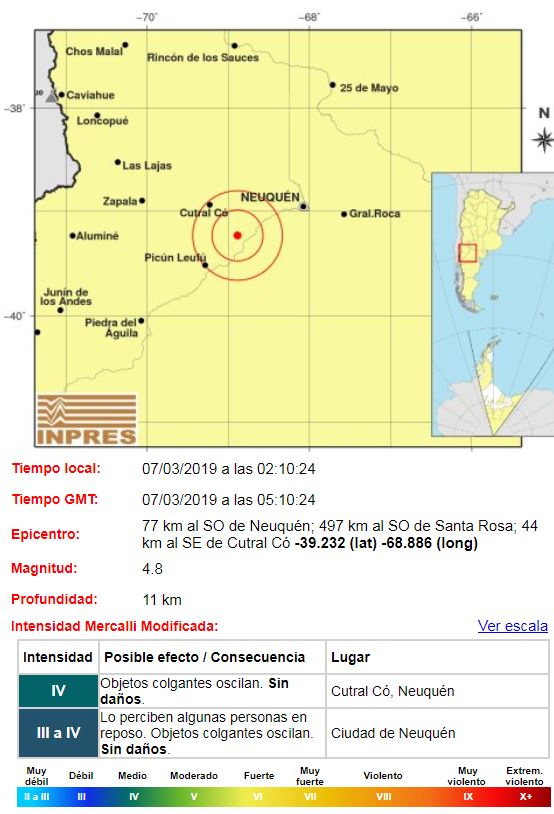 Su registro coincidió con el que había dado por la madrugada un grupo independiente de Chile: el temblor ocurrió hoy, a las 2.10, y tuvo una magnitud de 4,8 según la escala de Richter. En la de Mercalli, que mide la intensidad percibida, fue de IV (medio) en Cutral Co y de III (débil) a IV en Neuquén capital.