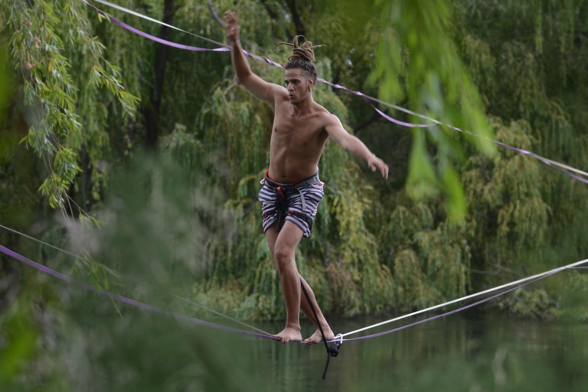 “Las sensaciones son muy variadas. Cuando te subís por primera vez a la cinta e intentás caminar, sentís mucho miedo. El cuerpo no responde como vos querés, no acciona las órdenes que vos le das entonces, de repente, te querés parar y el cuerpo se mantiene ahí, inmóvil”, explicó Sebastián Espíndola, uno de los que practica slackline desde hace dos años.