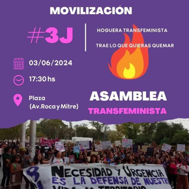 En la ciudad de Roca también habrá movilización por el 3 de junio. En un flyer compartido en redes sociales comunicaron que harán una hoguera «transfeminista» y solicitaron a las interesadas en participar que lleven algo para «quemar».