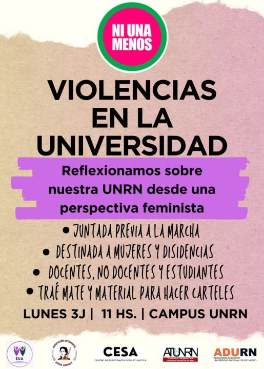En Viedma se realizarán actividades en la Universidad Nacional de Río Negro (UNRN) Sede Atlántica. A las 11, docentes, estudiantes y no docentes se reunirán en el campus para reflexionar sobre la universidad desde una perspectiva feminista. La comunidad universitaria está invitada a llevar mate y material para hacer carteles.