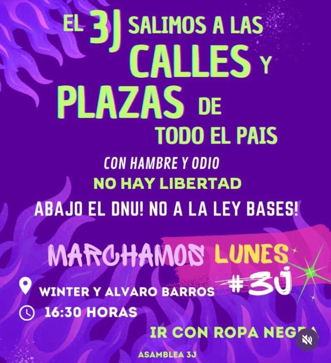 Por otra parte desde la Asamblea 3J adelantaron que este lunes realizarán un marcha para visibilizar su reclamo. Bajo el lema «el 3j salimos a las calles y plazas de todo el país. Con hambre y odio, no hay libertad. Abajo el DNU, no a la ley bases», convocaron a las interesadas en participar a reunirse a las 16.30 entre calle Winter y Alvaro Barros.