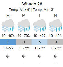 Desde el Servicio Meteorológico Nacional (SMN) indicaron que en la madrugada hay entre 10 y 40% de probabilidades de precipitaciones (puede ser lluvia o nieve), mientras que a la mañana del sábado asciende a un rango de entre 40 y 70%, con una temperatura de -1°C.
