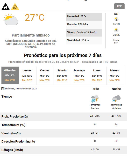 Según el SMN, las lluvias llegarán al Alto Valle en las primeras horas de la tarde en forma de fuertes tormentas que podrían estar acompañadas de granizo. El resto de la jornada se mantendrá inestable con posibles precipitaciones y tormentas eléctricas aisladas por la tarde noche.