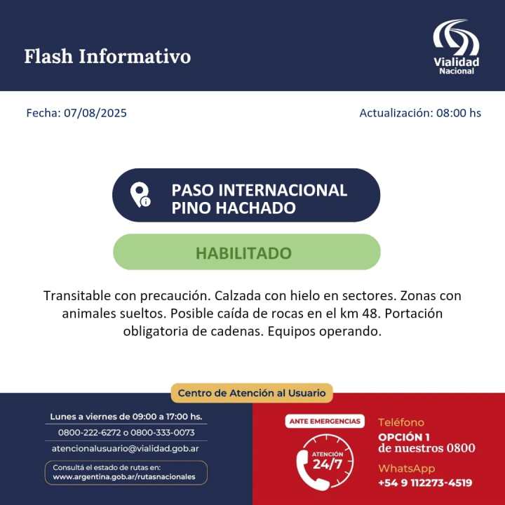 - Mamuil Malal (exTromen): Paso habilitado en horario normal, transitable con precaución. Sectores con hielo. Equipos operando. Portación obligatoria de cadenas.