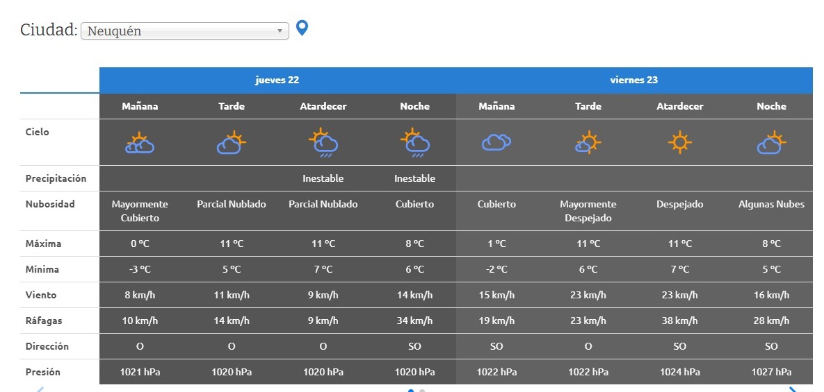 En Neuquén, los cielos continuarán inestables durante la jornada del jueves y permanecerán mayormente cubiertos. La máxima será de 11°C y la mínima se ubicará en 0°C.