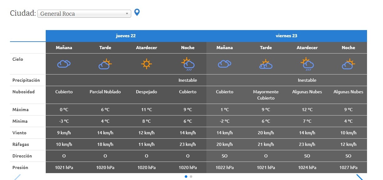 En Roca, las condiciones serán bastante similares. Durante el jueves y viernes continuará la inestabilidad y la presencia de nubes. Las temperaturas oscilarán entre 11°C y -2°C.