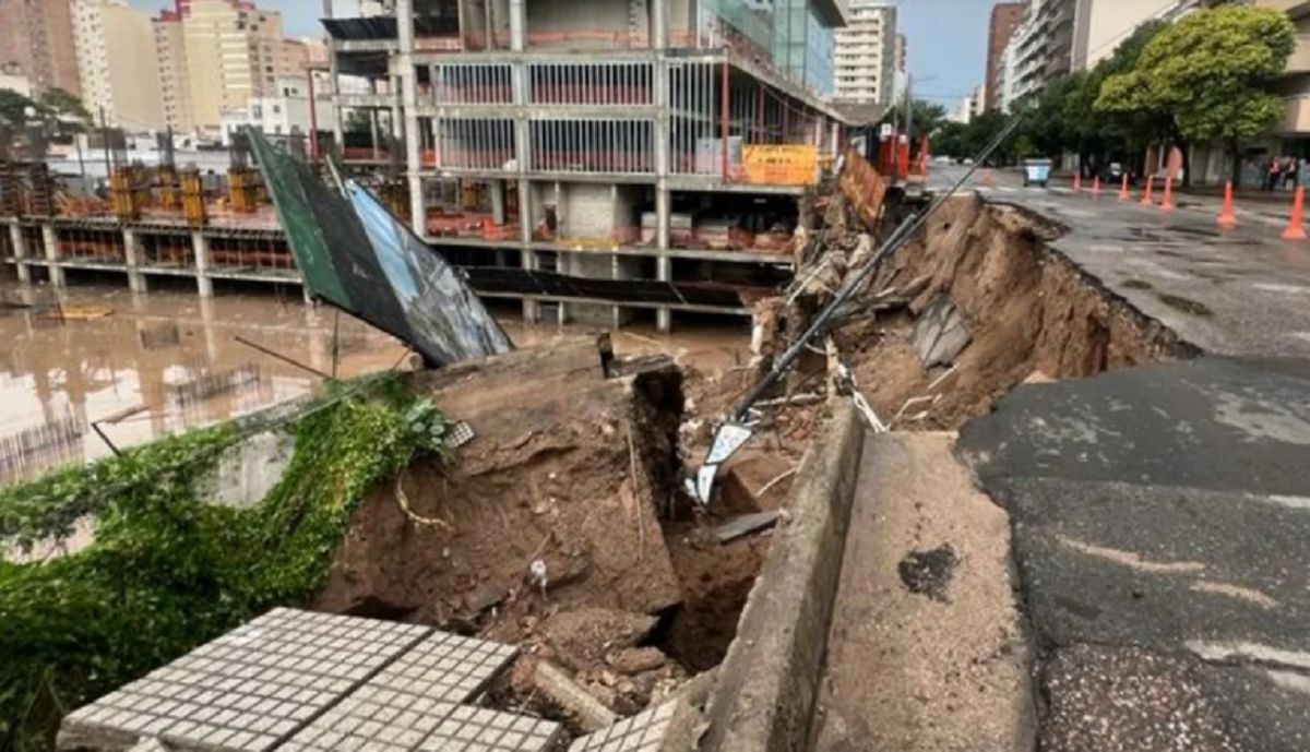 La intensa tormenta causó que la Avenida Vélez Sarsfield se desmoronó hacia una obra en construcción. También hubo inundaciones en Alta Gracia.