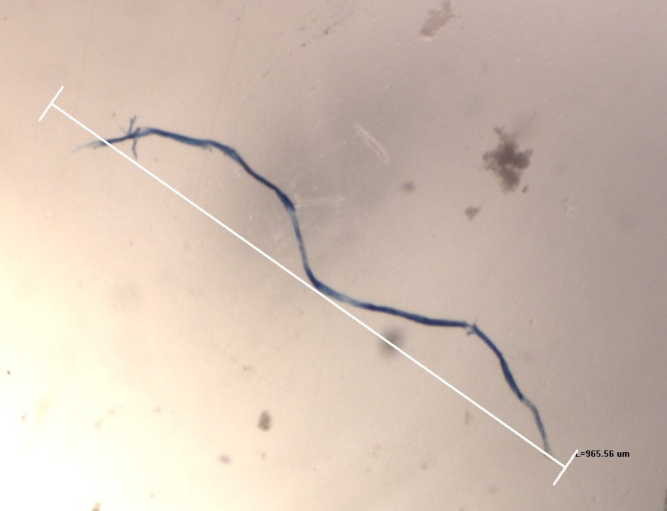 –Otra de las muestras obtenidas del contenido estomacal. Una hebra plástica, producto de una red–