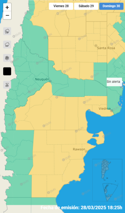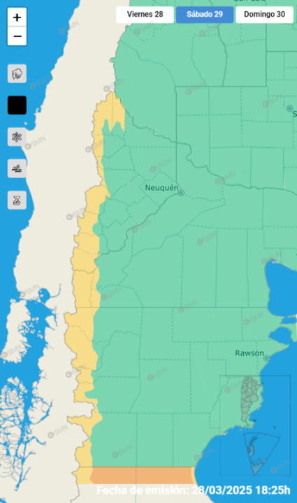 Durante el domingo, además, habrá una extensa alerta por viento en Río Negro, anunciada para la tarde.