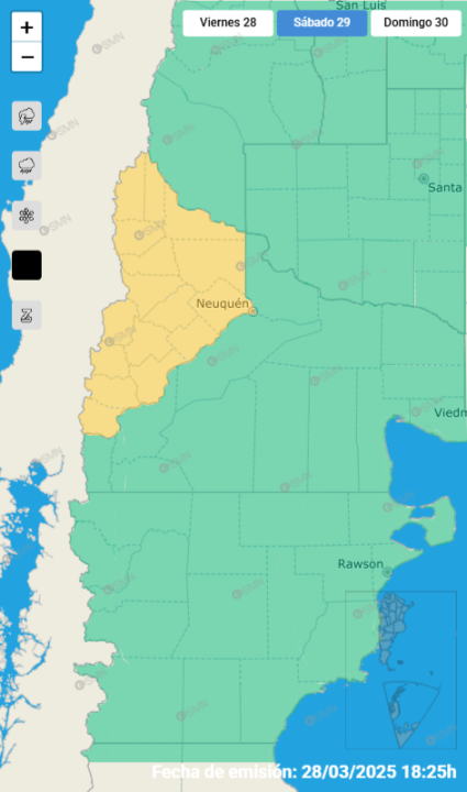 Además, el Servicio Metereológico Nacional anunció una alerta amarilla por viento, que incluirá «ráfagas que pueden superar los 90 km/h» este sábado y alcanzará a la totalidad de la provincia de Neuquén.