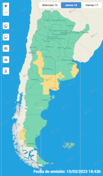 El SMN detalló que los lugares afectados este jueves serán Conesa, Meseta de Adolfo Alsina, Meseta de San Antonio, Valcheta, Avellaneda y Pichi Mahuida.