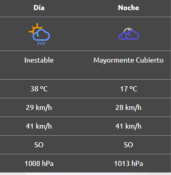 Por la noche, la mínima será de 15°C, mientras que el viento cambiará de dirección hacia el sudeste a casi 40 km/h, con ráfagas de 55 km/h.