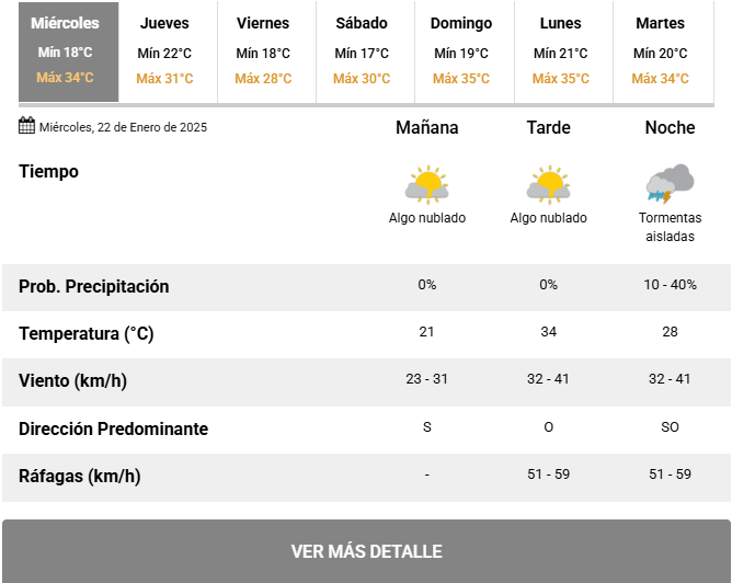 Además, se prevé viento hacia la tarde y la noche, con velocidades de hasta 59 kilómetros por hora. Al finalizar el día, también se pronostican tormentas aisladas.