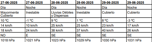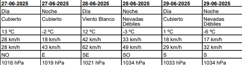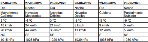 El sábado, durante el día pronosticaron viento blanco y una máxima de 12°C, acompañado por ráfagas superiores a los 60 km/h. Por la noche, anticiparon nevadas débiles y una mínima de -3°C.
