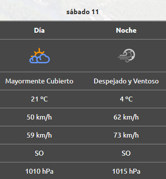 El viento soplará desde el oeste a más de 40 km/h durante la tarde, acompañado por ráfagas superiores a los 50 km/h. Por la noche, cambiará de dirección hacia el sudoeste, y las ráfagas aumentarán su incidencia a 61 km/h.