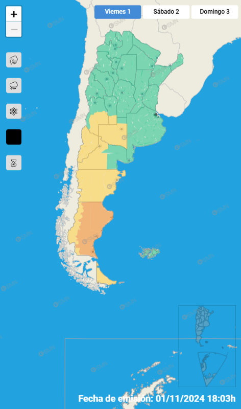 Se trata de un alerta amarillo para zonas de las provincias de San Luis, La Pampa, Mendoza, Neuquén, Río Negro, Chubut y Tierra del Fuego. Mientras que en casi la totalidad Santa Cruz, el aviso es de alerta naranja.