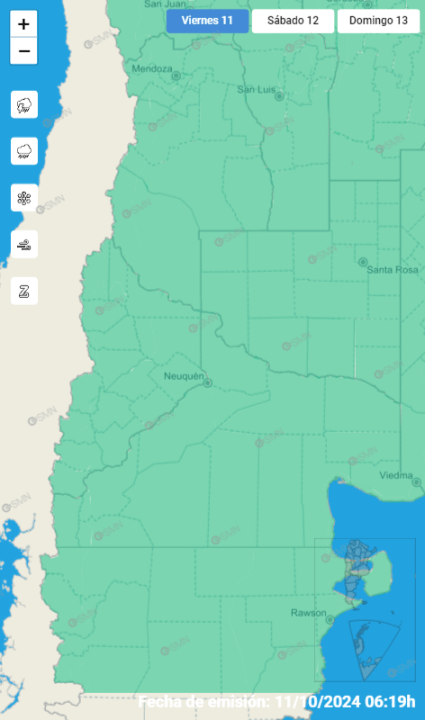 En Neuquén, esperaban que afectara la zona de Los Lagos, cordillera de Huiliches, cordillera de Lácar y sur de Aluminé. Aunque ya no rige la alerta, se anuncia lluvia y nieve para este viernes a mañana. Hacia la tarde, se esperan lluvias aisladas.