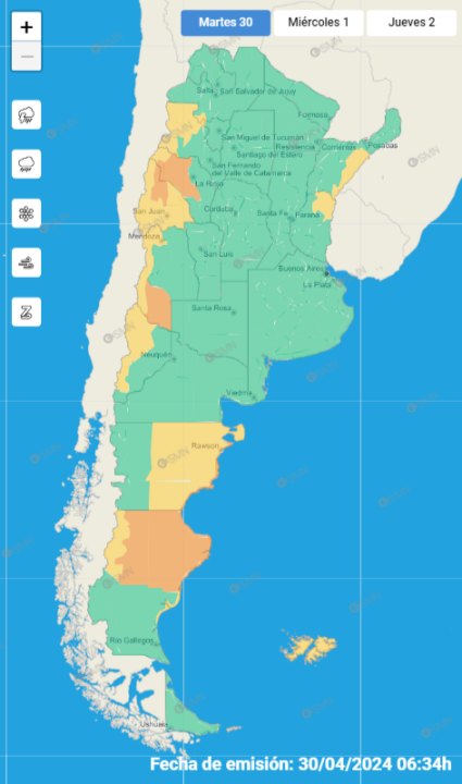 Los vientos esperados en la provincia de Santa Cruz y de Chubut serán del sector sur, con velocidades entre 60 y 75 km/h, y ráfagas que pueden superar los 100 km/h.