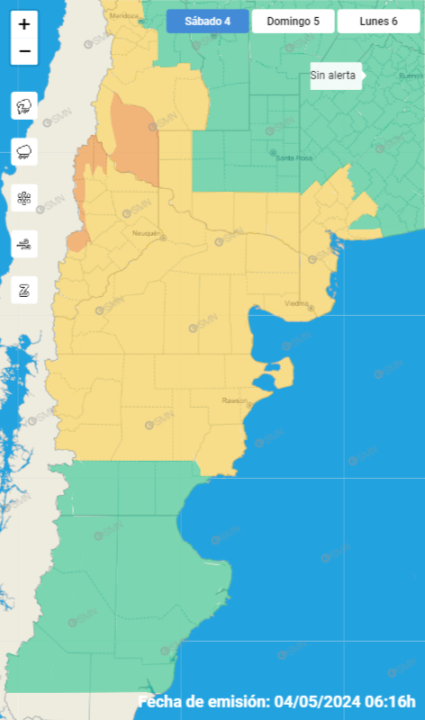 Cordillera de Aluminé – Cordillera de Chos Malal – Cordillera de Loncopué – Cordillera de Minas – Cordillera de Picunches – Cordillera de Ñorquín: en esta zona el SMN emitió un alerta naranja por nevadas, y amarillo, durante la tarde. Por el viento, hay advertencia de nivel amarillo, para el sábado por la mañana y tarde.