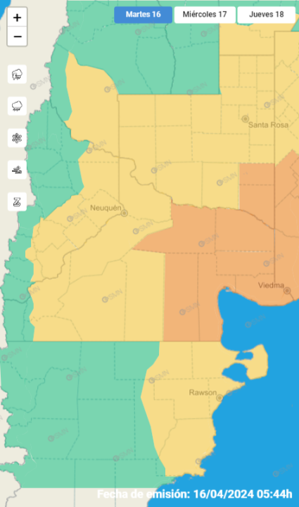 Solo regirá durante la mañana en meseta de Pilcaniyeu, meseta de Ñorquincó, Nueve de Julio, oeste de El Cuy, Veinticinco de Mayo, Catán Lil, Collón Curá, Zapala, zona baja de Aluminé, zona baja de Huiliche, zona baja de Lácar