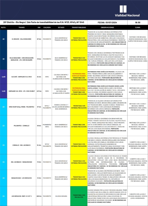 Por otro lado, Vialidad Rionegrina informó que, debido a las crecidas registradas en el caudal del río Chico, se encuentra habilitado de manera provisoria el uso del puente sobre Ruta Provincial 6, únicamente para vehículos livianos y camionetas. El tránsito de vehículos pesados se encuentra momentáneamente restringido, hasta tanto no descienda el nivel del río y su caudal permita utilizar los desvíos correspondientes.