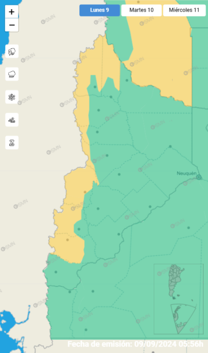 – Cordillera de Aluminé – Cordillera de Chos Malal – Cordillera de Loncopué – Cordillera de Minas – Cordillera de Picunches – Cordillera de Ñorquín: el alerta rige para la noche del lunes y mañana del martes.