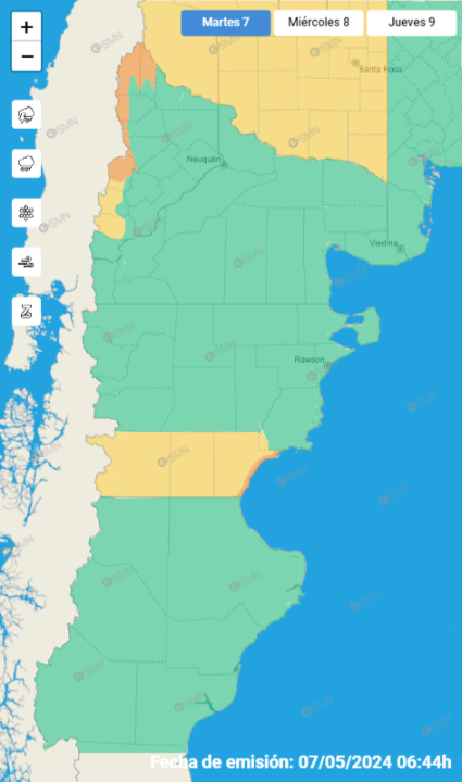 Según lo informado por el SMN, se esperan nevadas fuertes y persistentes en toda la cordillera de Neuquén durante el mediodía y la tarde de este martes principalmente en la cordillera de Neuquén, desde Junín de los Andes hasta el Norte Neuquino en la que rige un alerta naranja. Por ahora la cordillera de Río Negro no está bajo alerta.