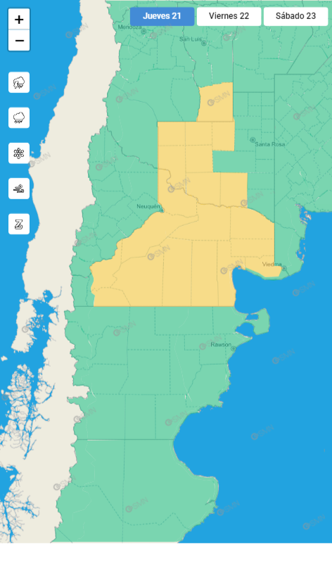 Por su parte, Protección Civil de Río Negro también emitió la advertencia y esperan valores de precipitación acumulada entre 10 y 25 mm.