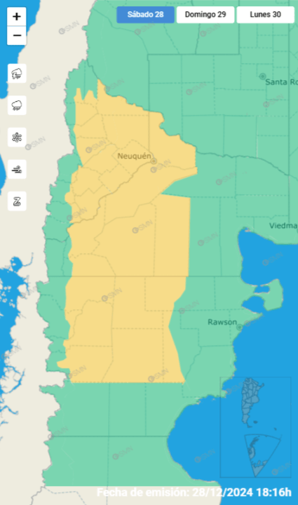 - Este de Loncopué – Este de Picunches – Este de Ñorquín – Oeste de Añelo – Oeste de Pehuenches – Sur de Chos Malal – Sur de Minas: la advertencia es para este sábado por la tarde.