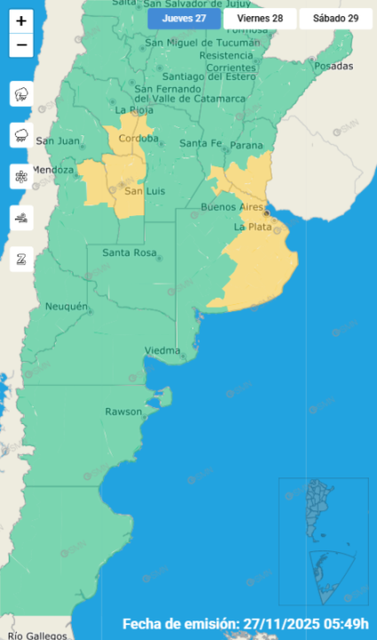 El Servicio Meteorológico Nacional (SMN) anunció que rige una advertencia en gran parte del país para este 27 de noviembre.