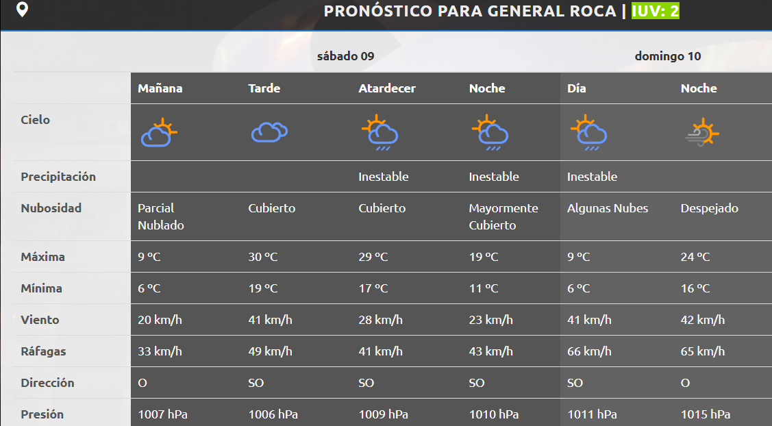 En Roca, el pronóstico marca probables lluvias durante el atardecer y la noche del sábado, y parte del domingo. Para mañana, se espera una jornada ventosa con ráfagas que alcanzarán los 66 km/h.