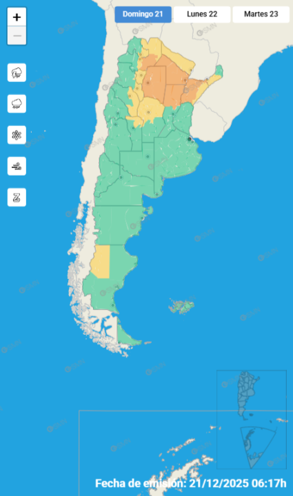 El Servicio Meteorológico Nacional (SMN) emitió una alerta en 15 provincias por tormentas fuertes, posible caída de granizo y ráfagas durante la jornada de este domingo 21 de diciembre. Hay una advertencia para una provincia de la Patagonia.