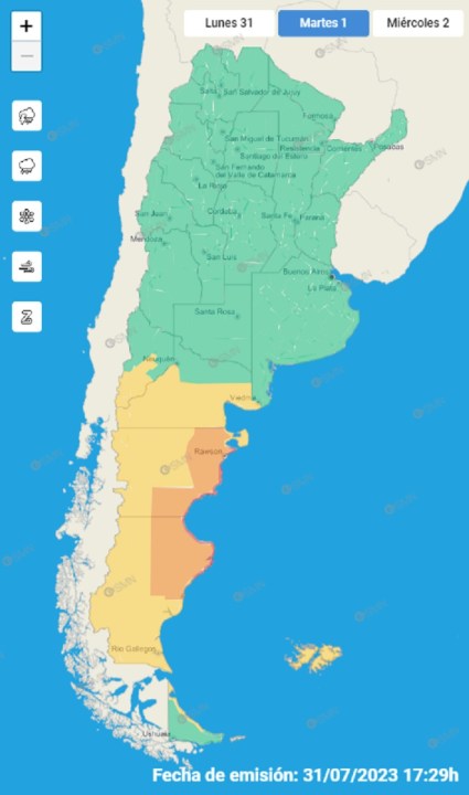 Tras un alerta naranja por vientos este lunes en gran parte del sur de Río Negro y amarillo entre Bariloche y Viedma, el Servicio Meteorológico Nacional rebajó la intensidad de la advertencia por vientos para el martes 1, aunque abarcará a la misma zona.