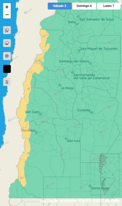 El Servicio Meteorológico Nacional anunció alerta amarilla por fuertes vientos para cuatro provincial este sábado 5 de julio. Se trata de: Mendoza, San Juan, La Rioja y Catamarca y esperan que continúe hasta el domingo 6 de julio. Te contamos los detalles.