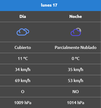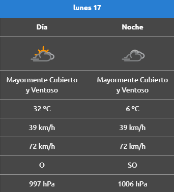 Según la Autoridad Interjurisdiccional de Cuencas (AIC), para este lunes en Neuquén capital se espera una jornada cubierta, con una máxima de 29 °C durante el día, vientos moderados del oeste que alcanzarán ráfagas de hasta 68 km/h y una presión de 1006 hPa. Por la noche, el cielo seguirá cubierto, la temperatura descenderá a 12 °C y el viento rotará al sudoeste, manteniendo ráfagas de 68 km/h, mientras la presión atmosférica aumentará a 1010 hPa.