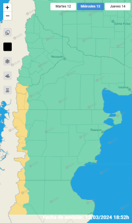 Para este miércoles también rige un alerta por lluvias, que alcanza a la zona andina de Río Negro, precisamente al departamento Bariloche. En Neuquén, afectará al departamento Los Lagos, donde se encuentra Villa La Angostura.