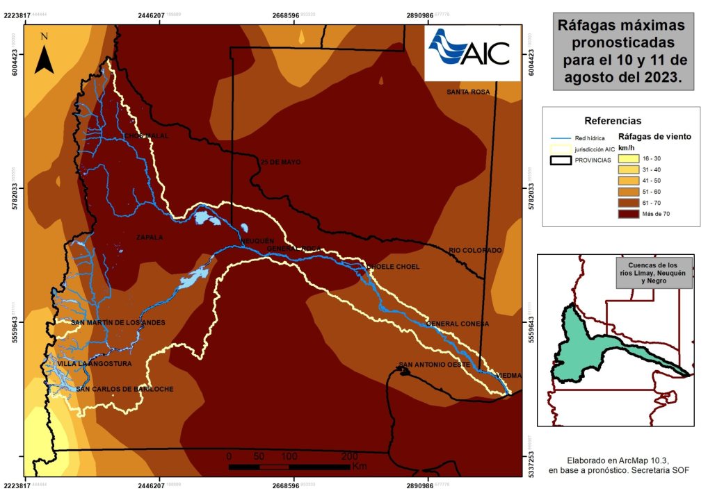 Desde la Autoridad Interjurisdiccional de Cuencas (AIC) comunicaron que el pasaje de un sistema frontal desde el Océano Pacífico, en el norte de la Patagonia, provoca desde ayer lluvias y nevadas en cordillera. Para hoy “se esperan períodos de viento fuerte (zonda) en el norte de la Patagonia. Descenso de la temperatura a partir del viernes. Mejoran las condiciones a partir del sábado 12 de agosto. Indicaron que el domingo se espera tiempo bueno y ascenso de la temperatura en la región.