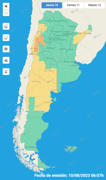 Por otro lado, habrá viento del sector oeste (y luego del sector sur, hacia el viernes 11) con velocidades entre 50 y 75 km/h, y ráfagas que pueden alcanzar localmente los 100 km/h. Hay alerta por nieve, para este jueves por la mañana y tarde, y por viento para la tarde de hoy.
