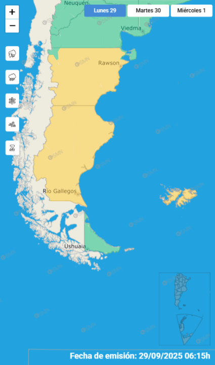 Las malas condiciones del tiempo se mantienen este lunes 29 de septiembre en el sur del país. El Servicio Meteorológico Nacional (SMN) renovó sus alertas por viento fuerte en tres provincias. Las zonas afectadas en la Patagonia y los peores horarios.