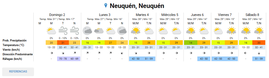 Por otro lado en Neuquén Capital se anunció una jornada ventosa con probabilidades de precipitación de un 10% por la tarde y noche. La ráfaga más fuerte alcanzará los 78 kilómetros por hora. La temperatura máxima será de 31°.