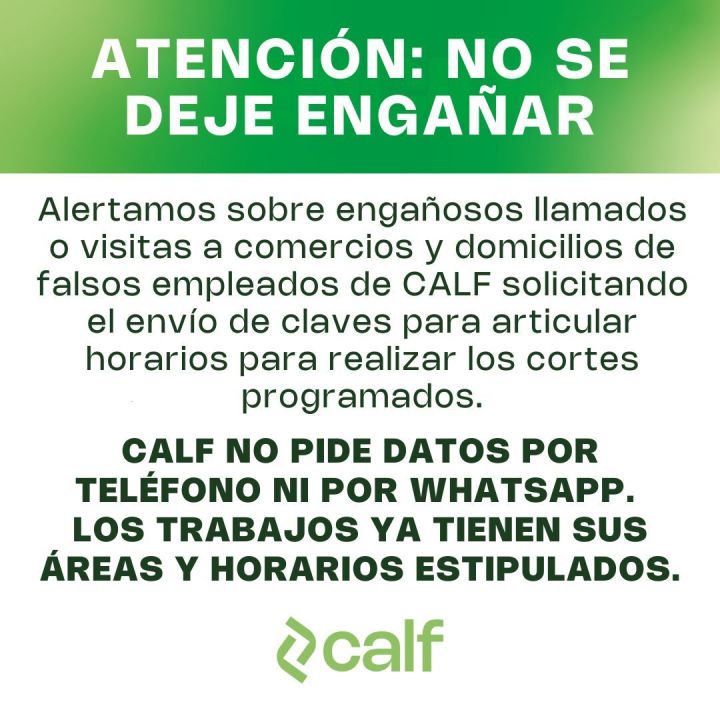 Calf aclaró que la empresa «no pide datos por teléfono ni por WhatsApp», y por ello aseguran que se trata de una maniobra para lograr una estafa.