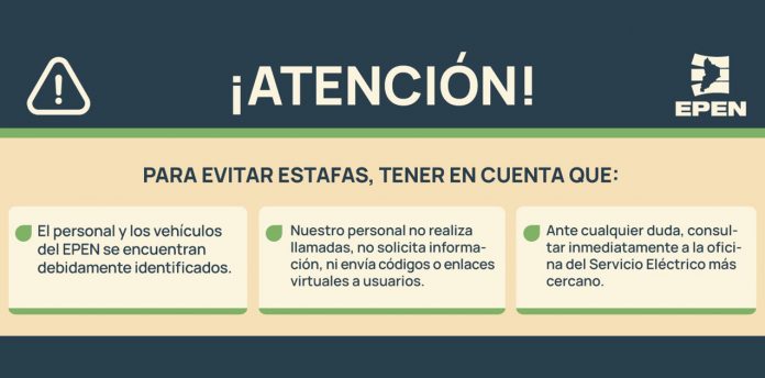 El EPEN recordó que el organismo no realiza llamados de ningún tipo, no solicita información, no envía códigos ni enlaces virtuales ni datos, no acude a domicilios -salvo en caso de reclamo-, y tanto el personal como los vehículos de la empresa se encuentran debidamente identificados.