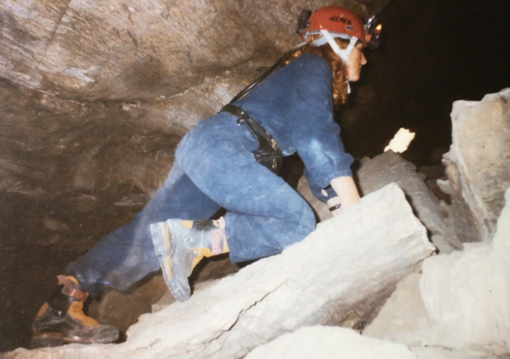 Susana Domínguez es sencilla pero el tono pelirrojo de su pelo no la deja pasar desapercibida. Es posible imaginarla como docente, pero sorprende verla en fotos con arnés y linterna en la frente, de panza en el fondo de una cavidad, en la profundidad del suelo neuquino.
