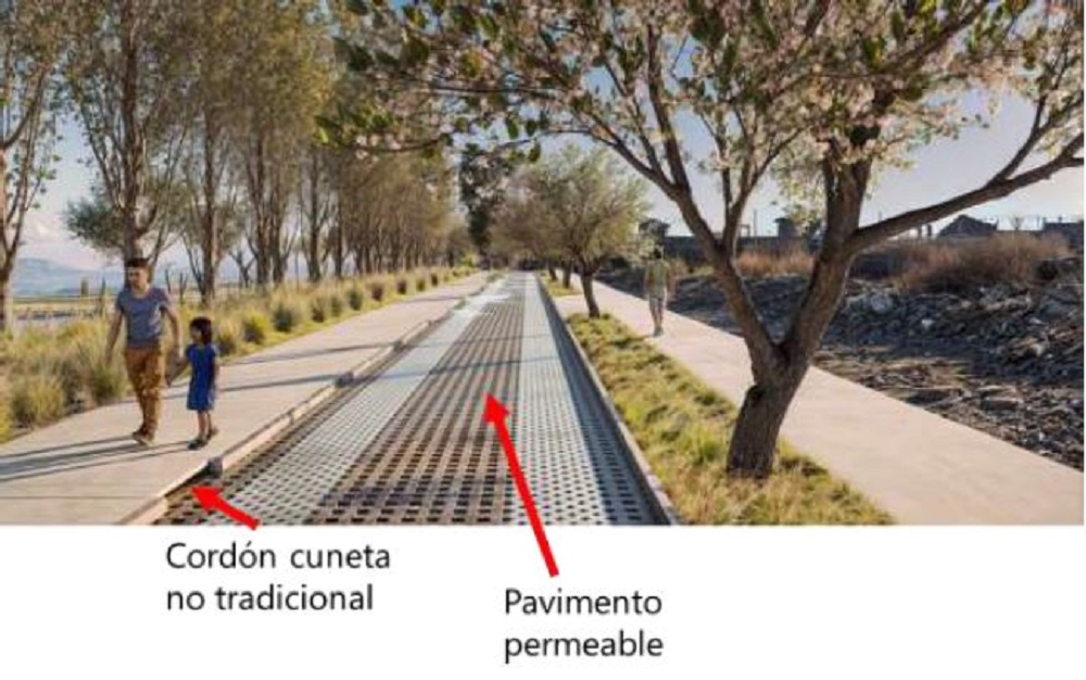 • Captación del agua de lluvia a través de sistemas de drenaje en superficie, con canales de drenaje tipo francés y sumideros, así como mediante la recolección en jardines inundables y espacios verdes y pavimentos permeables.