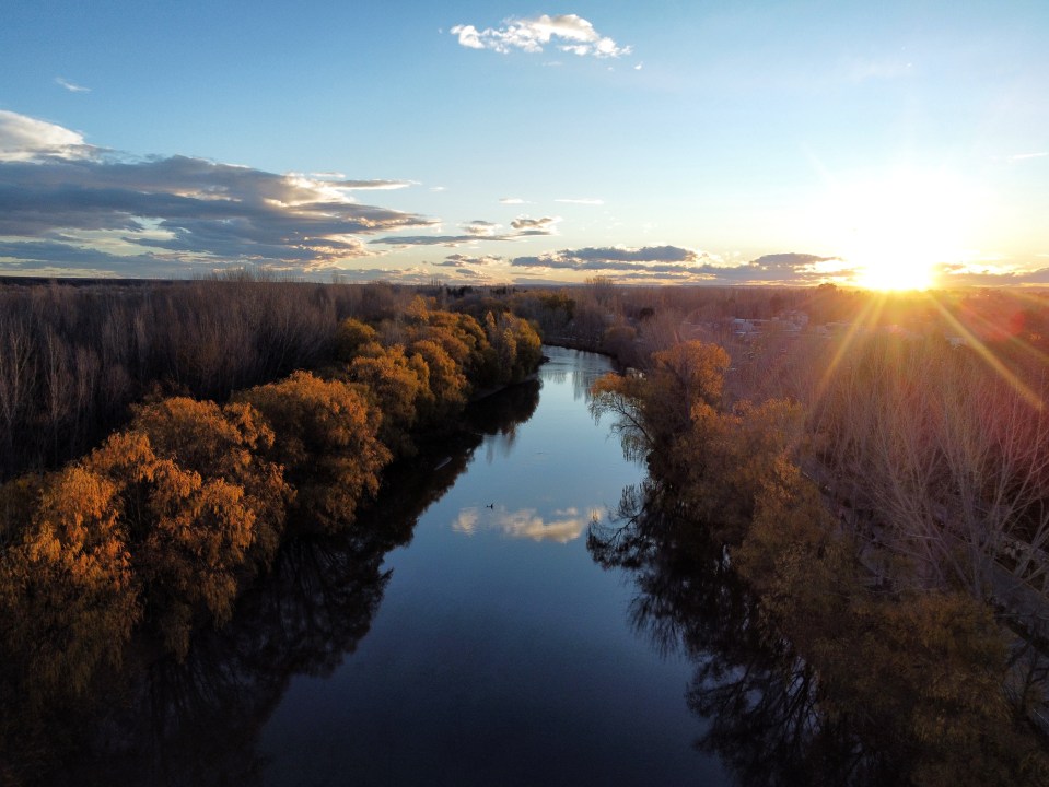A medida que el sol desciende en el horizonte, sus colores dorados y anaranjados se reflejan sobre las aguas cristalinas del río, creando una atmósfera mágica. Las sombras de los árboles y la vegetación que bordean las orillas se alargan, mientras que la luz suave del atardecer ilumina el paisaje, generando un ambiente tranquilo y perfecto para disfrutar de paseos, relajarse o simplemente admirar la naturaleza.
